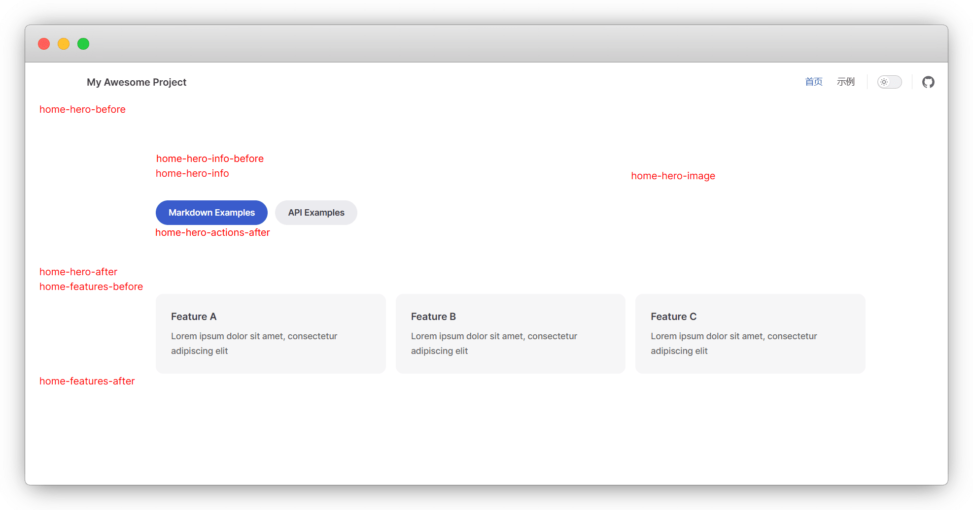 当 Frontmatter 配置 layout: home (默认)时插槽及位置